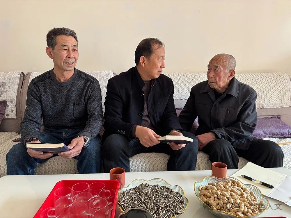 笔者(中)赴黄岛采访朱保荣老先生(右)
