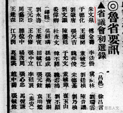 据《时事新报》民国七年(1918)七月廿四日载:“鲁省要讯 省议会初选录(昌邑) 徐昌言、朱文泉、傅金寿、李法侨、冀庆林、刘瑞云、于德化、王德闻、董毓芝、刘廷桢、陈贵谱、刘肇唐、张天吉、魏邦俊、宋德基、刘乃桢、刘文灏、陈湛廷、于允文、董毓璋、崔玉山、姜伟卿、杜彦文、韓丕绪、魏志鸿、刘丕显”。该报纸公示的是初选结果,昌邑县共有26人符合条件而进入初选名单。从这个名单中,我们依稀可以看到一些熟悉的名字,大都出自昌邑当时的名门望族,竞争极为激烈,最后有几人正式当选,现无从查考,参考第一届规定的全省132个名额,不会有大的变动,每县最后可能只有一名正式入选。之后的资料表明,朱文泉成为第二届省议会议员,且第三届连任,其任职时间是比较长的。
