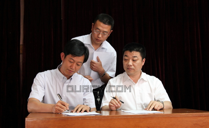 市建筑工程质量安全监督站站长齐俊杰(右一)与兴昌建筑公司负责人签订“安全生产责任书”。