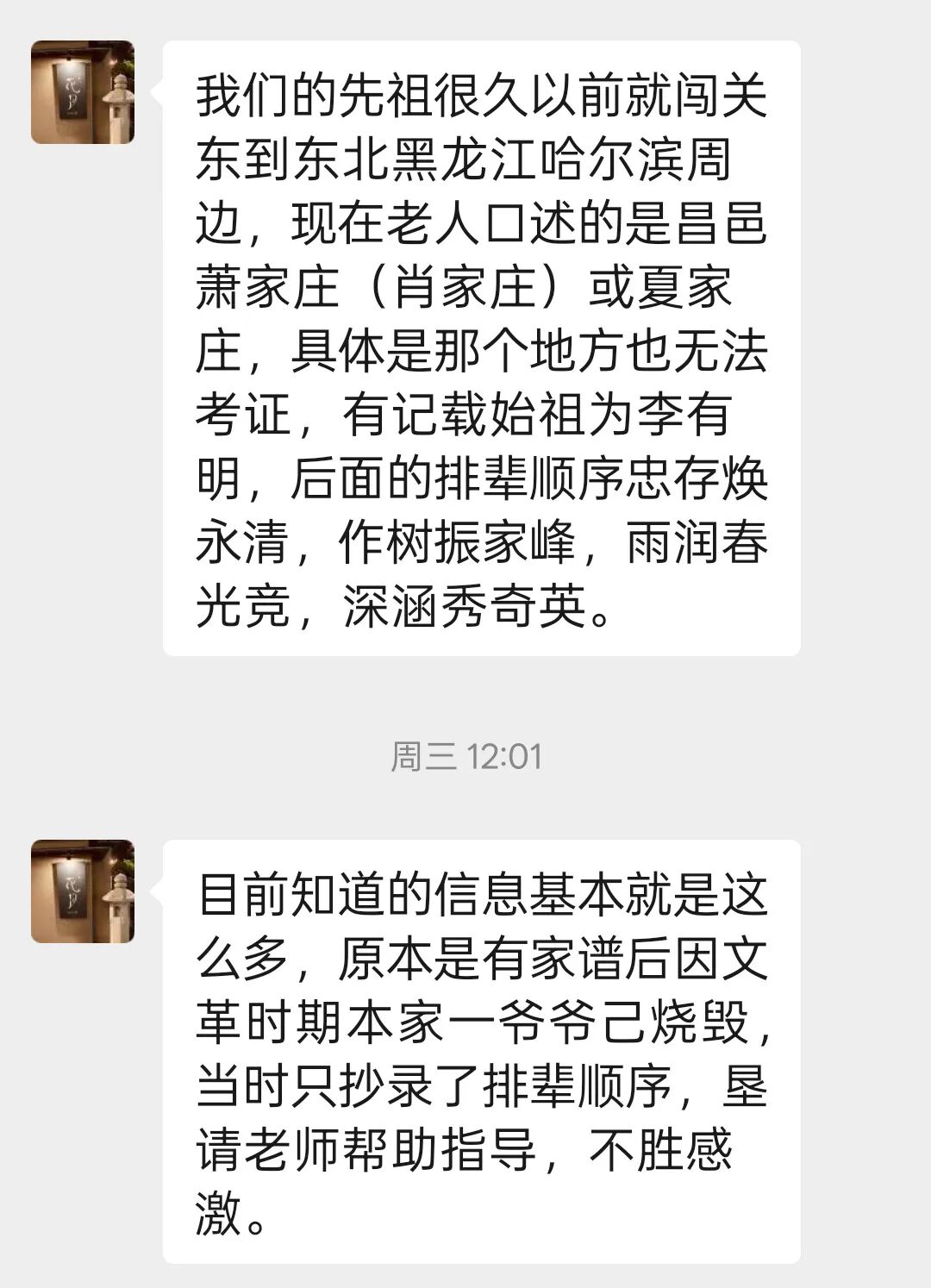 目前知道的信息基本就是这么多,原本是有家谱后因文革时期本家一务爷己烧毁当时只抄录了排辈顺序,垦请老师帮助指导,不胜感激。
