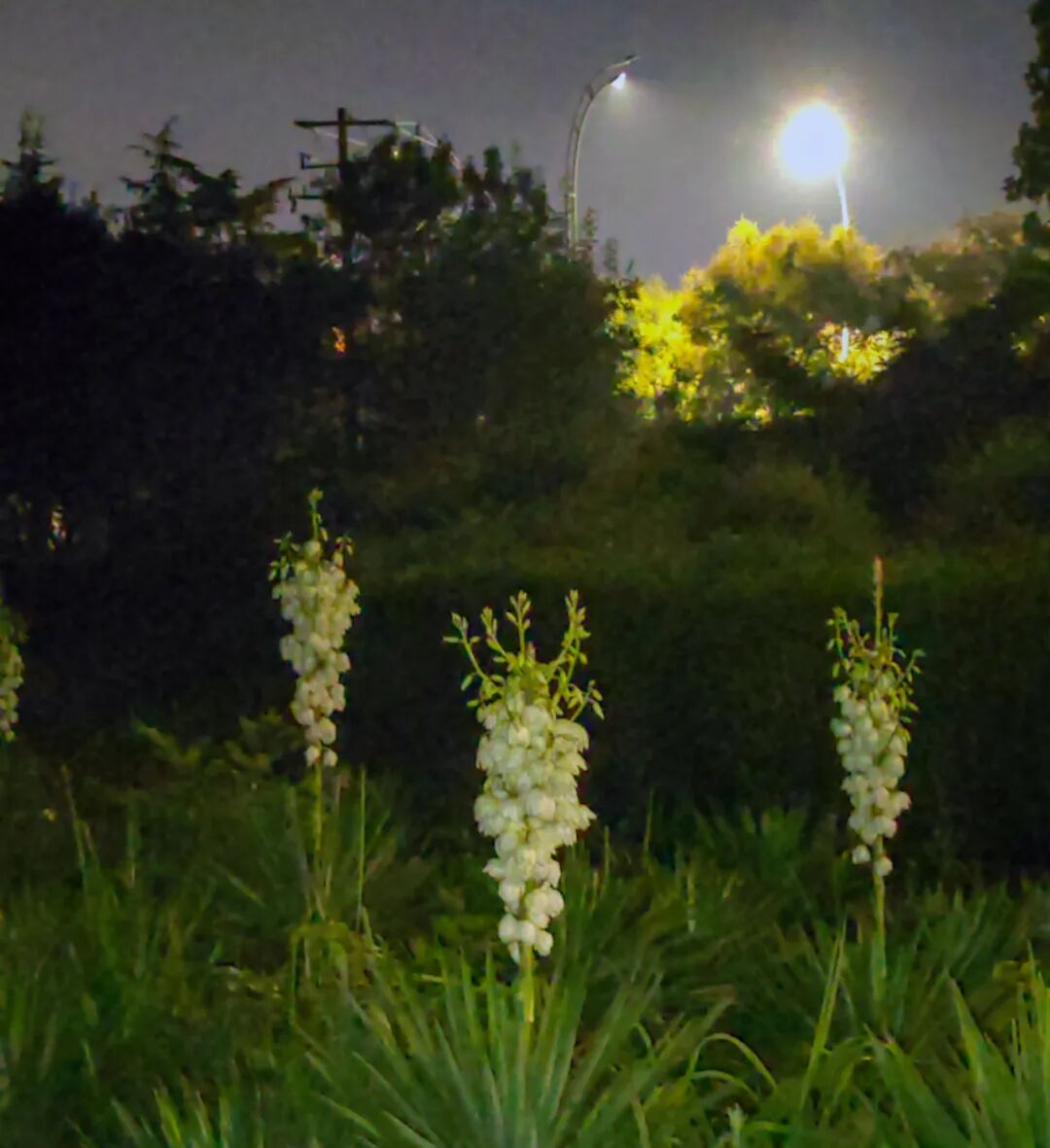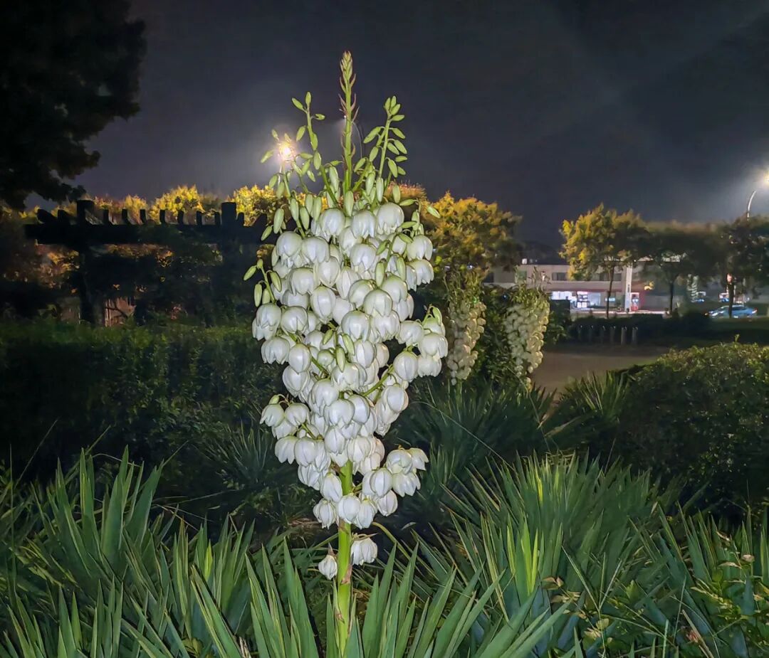 黑夜,宛如一匹墨色绸缎,轻轻覆盖在咱们大昌邑这个九月的夜晚,覆盖着这暗绿色的神秘大地。晚饭后例行去潍河湿地公园散步,无意间侧目,蓦然发现路边那一片绿地上的丝兰不知何时已悄然盛开。它们伫立在明亮的高压钠灯灯光下,被照得通体皎洁,恍若月光雕琢而成的仙子,在光影之中亭亭玉立。她们茎干笔直挺拔,不蔓不枝地伸向星空,每一节丫都缀着夜的清露,如同宿泪未干,又似星辰依附。