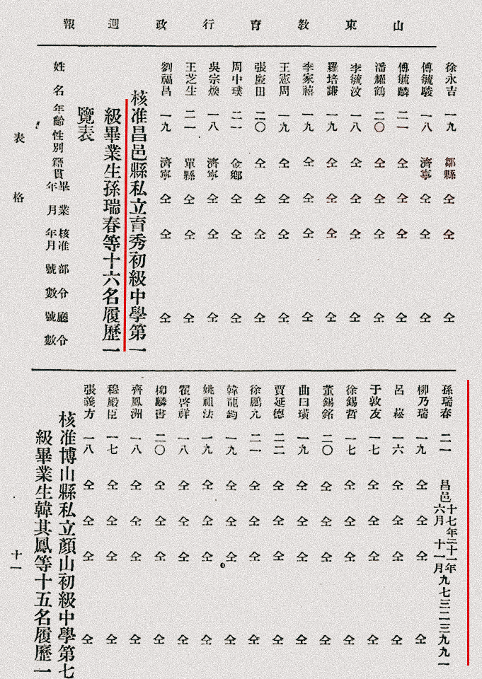 1933 年《山东教育行政周报》 [ 第221期 ,12页 ]核准昌邑县私立育秀初级中学第一级毕业生孙瑞春等十六名履历一览表。