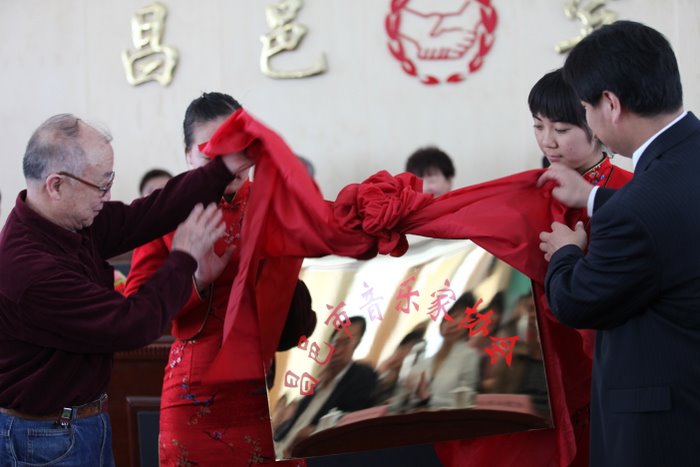 庄鹏部长(右一)和潍坊市音协名誉主席吴超凡为昌邑市音乐家协会授牌。