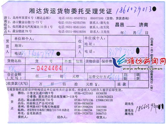 安女士向记者出示了发货凭证,她找的物流是湘达货运,发货日期为3月18日,从昌邑发往济南,运费是5元钱。
