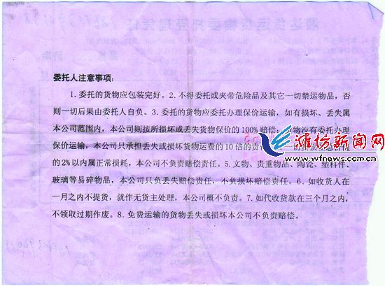 “这凭证背面的内容,在办理手续时,物流公司的工作人员没让我们看。对方也没说让我们办理保价运输,只是收了5元钱的运费。”安女士看着凭证无奈地说。