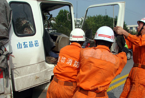 9月17日中午,北海路与南环路交叉路口以西发生一起交通事故,一辆四轮货运车与一辆农用三轮车发生碰撞,四轮货运车内一人被困,急待救援。昌邑市公安消防大队临危受命,火速出警,迅速将被困人员救出。