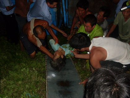 晚9时17分,随着“一、二、三”的口号声,三轮车终于在所有人的努力下露出了一个小小的缝隙,民警和消防队员立即冲上前从缝隙中将伤者救出(如图)并马上抬上救护车送往了医院。