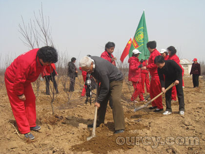 3月20日上午,在昌邑市潍河生态风光带内,几位年逾古稀的老人们相互协作,挥锹植下以自己或亲人名字命名的共150棵“奥运树”。为让“绿色奥运”的理念深入人心,努力营造生态家园的和谐社会氛围,在昌邑市园林局与潍坊伦嘉生态俱乐部的组织下,来自潍坊和昌邑的36位老人们参与了这次公益植树活动。(记者 张伟丽 刘晓梅 摄)