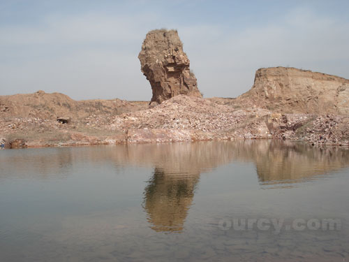 在该山西北侧的山谷里,一块近二十米高的柱状岩石突兀林立。从南面五十米处望去,岩石上方呈现一张巨大的狮面轮廓,惟妙惟肖,巧夺天工。狮面与下面的石头浑然一体,使狮子愈发显得威猛无比,气势不凡。石狮映在前面清澈见底的水塘中,亦真亦幻,让人啧啧称奇。