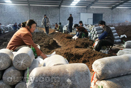 昌邑市饮马镇常屯村建起集菌种菌包培养、菌棒生产和大田树下栽培及工厂化加工于一体的同利食用菌基地,仅栽培大棚面积就达500亩,日产黑木耳、双孢菇和香菇5000多斤,吸纳了全村和社会的200多名富余劳力,图为菌包制作车间.(图文: 昌邑市文化馆 郝文强 邮编:261300 电话:7087515)