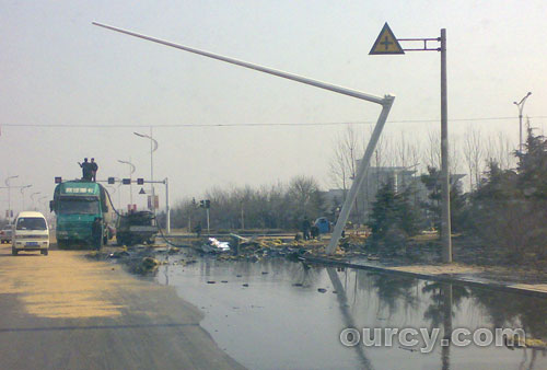 3月5日,一辆油罐车行至烟汕路与奎聚路交叉路口(文山中学附近)时,发生交通事故撞歪了路口的监视器杆,油罐破损,原油洒落泄漏,沿烟汕路流淌数百米远。