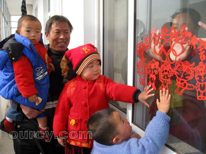 2008年是奥运年,该市的民间艺人创作了不少以奥运为主题的剪纸作品。春节到来之际,辛赵村农民李增芬用剪纸艺术展现了人民欢庆奥运的场景,她剪出的福娃生动活泼,更是惹人喜爱。乡亲们闻讯纷纷上门讨要,拿回家中有的贴到墙上、有的贴到门窗上,表达出人们对北京奥运会的期待和祝福,成为过年新时尚。(记者 张伟丽 摄)