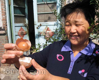 淌”入碗里的还有一个小鸡蛋!几位村民们听说后,也纷纷赶来瞧新鲜。经测量,外面的蛋壳直径约7.8厘米,蛋壳较粗糙,里面的小蛋蛋壳较为坚硬,壳面上带着几处凝固的红血丝,小鸡蛋直径约为5.6厘米,比普通的鸡蛋略为小一点儿。亓国芳说,她家喂了十几只产蛋的母鸡,平时家人吃的鸡蛋全来自这些鸡。至于自家母鸡为什么会产下这个“蛋中蛋”,她怎么也想不明白。