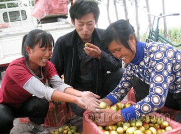9月30日下午,在昌邑市卜庄镇大陆村梨枣批发销售市场上,乡亲们正在帮着村民闫爱芳挑选梨枣装箱外运。今年该村梨枣又获丰收,闫爱芳的9亩梨枣纯收入又过了5万元。 大陆村把种植梨枣作为绿色产业,近年来又建起了梨枣批发销售市场,新上了12个民营冷风库,年贮藏达50万公斤,真正形成了产前、产中、产后的一条龙服务,带动了梨枣产业的快速健康发展。目前,全村梨枣总面积已达到2000多亩。眼下,大陆村梨枣声名远播,产品供不应求,销往上海、大连、烟台、青岛等地。