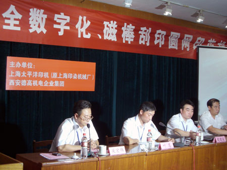 上海太成套印机分公司向与会用户介绍了企业运行情况及全数字化、磁棒刮印圆网印花机技术开发过程和市场前景。圆网印花机的主设计详细向用户介绍了该产品的技术性能和技术特点和优势。