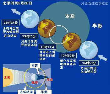 根据天文测算,今天发生的月全食的整个过程是:16时51分月亮开始进入地球本影,17时52分整个月亮被地球本影吞没。由于此时的太阳还未落山,这段月食过程是无法看到的。此后,从我国的东部沿海地区开始,已淹没在地球本影中的月亮从东方升起,即带食月出,太阳则从西方落下。18时37分月亮进入地球本影的最深处,即月亮中心离地球本影中心最近。19时23分月亮开始离开地球本影,月亮逐渐开始露出亮光,随着时间的推移,亮光面慢慢由小变大,20时24分月亮完全离开地球本影,即复圆,此次月食宣告结束。