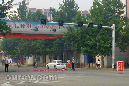 一中北部北海路与富昌街路口,警察正在拉起禁行横幅。
