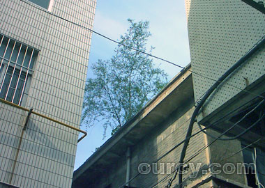 已废弃的旧楼楼顶上,生长着一棵柳树,且枝繁叶茂。