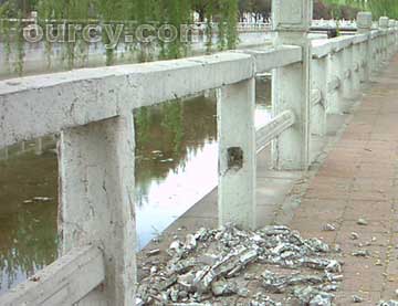 据了解,昌邑市天水路东侧的石渠已有几十年的历史了,该渠纵贯昌邑城区南北,渠宽约15米,渠内流水潺潺,渠西垂柳婆娑,渠东樱花茂盛,自建成起便是昌邑城区一道标志性的亮丽风景,更是市民晨练暮步、垂钓徜徉的好去处。 近几年,由于石渠两侧护栏年久失修,不少已经松动,护栏上的水泥也已严重风化脱落,钢筋外露。不仅影响美观,也给市民带来不安全因素。个别人还打起了护栏内钢筋的主意。 据记者观察,昌邑新华书店前一段不到百米的石渠,就缺失护栏八根。昌邑西关市场桥北约五十米的石渠,缺失护栏七根。(卫民)