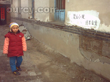 此房北邻程师傅夫妇气愤地讲,这地上的液体痕迹是人的尿液留下的,墙皮脱落也是由于尿液浸蚀造成的。他们自家的后墙也有相同的遭遇,随后,笔者在程师傅家房后看到了相似的情景,尽管墙皮还没有脱落,但墙上和地上的尿液痕迹非常明显。墙上也有这样一条警示语:“请君自重,禁止小便,禁止高声喧哗”。