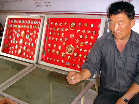 6月14日上午,昌邑市夏店镇居民耿维峰正在展示他收藏的毛主席像章。