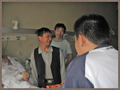 亮亮的父亲用我们昌邑人朴素的方式,向同学们的到来表示了深深的谢意。又对大家说,“现在看来治疗情况非常乐观”。他不断地描述着医院的技术如何如何高,北大的师生如何如何好,亮亮的患病经历让这位父亲意外的体验到了周围的一切都是那么善良和热情,却全然忘记了自己作为父亲在儿子的治疗期间经历的苦难,亮亮住院前,父亲与亮亮挤在宿舍的一张床上睡觉,照顾儿子起居,住院后,父亲和母亲就住在病房的走廊里,晚上睡在走廊里的简易临时床上,却毫无怨言,可怜天下父母心!