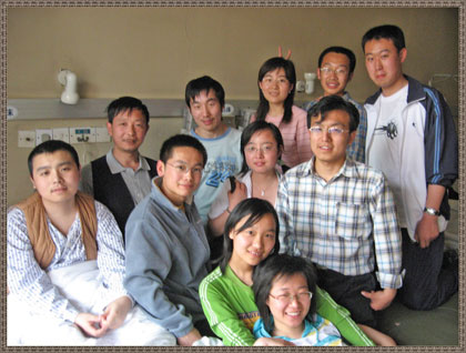 由于此前没有人去过亮亮就医的医院,中途又需转车,大家一路颠簸,几经周折,终于来到医院,并在热心护士的指引下找到亮亮的病房,正巧马亮亮的父亲站在病房外,见到同学们,他热情的招呼大家进去。病房不大,4张病床南北排列,马亮亮的病床在最南边靠近窗的位置。他围被而坐,病床边还坐着亮亮北大同班的几个同学,这几个同学在用带来的学习资料为亮亮补习功课,半年多来,亮亮一直在病床上坚持自修学业! 发现故乡同学们的到来,亮亮极为高兴,马上招呼大家坐下,同学们各自一一做了自我介绍。马亮亮同学精神状态非常好,谈话间从容不迫,面对病魔,没有丝毫的自卑或沮丧。当被问及病情时,他说再过20天就出院了,自己目前很好,没什么大碍,“只是不能像你们一样说跑就跑,说跳就跳了,”接着他说“以后我会多锻炼,然后就能像你们一样正常的走路了。”褚秉浩同学问他平时腿上有什么感觉,他说“不知道了,”又笑了笑,说“化疗的时候好像很不舒服,但都过来了。”说这些时那种从容与豁达,让人感到震撼,尽管他的身体可能会出现终身残疾,可是他还拥有一颗与常人一样健康的心,他的毅力会让这颗心更坚强和富有智慧。