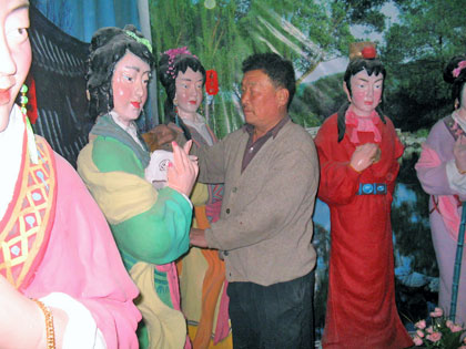 图为耿维峰轻轻为《红楼梦》中人物“李纨”拂去身上尘土。