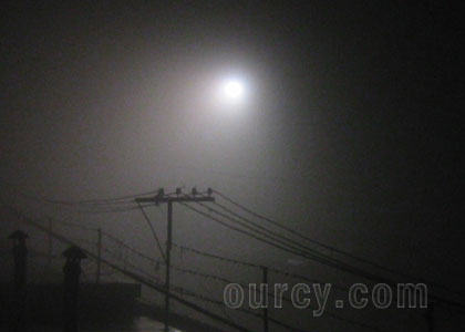 城里街上的路灯已无法把光线传播到地面,路灯后的建筑物看不到一点轮廓