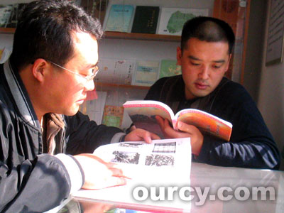10月31日,在昌邑市中华诗词馆,两青年男子正在聚精会神地阅读着馆内的藏书。
