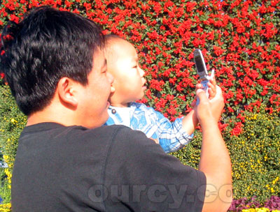 9月22日上午,在昌邑市宋庄镇苗木展示大厅外,一对父子正在用手机拍摄面前的“花船”。