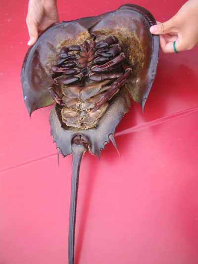 眼前这两只保存完好的鲎鱼标本(如图,左边为正面,右边为反面)一雌一雄,大的身长约60厘米,体色是棕褐色,长着一条很长的剑状尾,壳似海龟、壳下长着许多脚,类似螃蟹脚(如图),样子十分古怪。