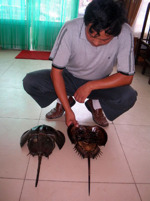 李建伟告诉记者,这两只鲎鱼标本是一位南方朋友带给自己的。他已在海边居住几年了,见过许多奇特的海中生物,但是鲎鱼还是第一次见到,他一定会保存好它们。