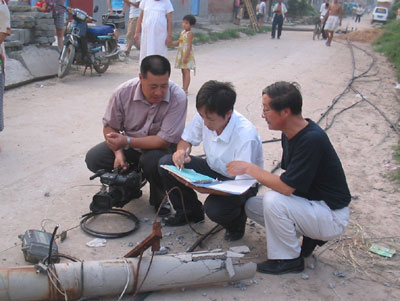 十几分钟后,记者获悉赶到了现场。在发生事故的路段上,两根被挂倒的电线杆正横躺在路边,另外两根发生严重歪斜(如图),电线、电话线、有线电视线错杂散于路面,与此各有关的各单位工作人员正在处理事故现场,详细研究着解决措施(如图)。此时,闻讯早已赶到的交警立即对事故进行了调查,并负责起指挥交通的任务。