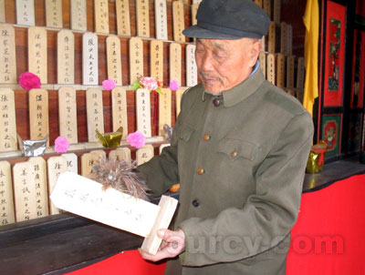 26年间,陈光聚每天天一亮就起床,看到烈士灵位有灰尘了,他就一个一个地擦洗(如图),再整齐地放回原处;发现地面脏了,他就拿来扫帚,认真清扫着每一寸地面;只要有人说院子里的冬青不整齐了,他就赶紧拿把剪刀认真地修剪……
