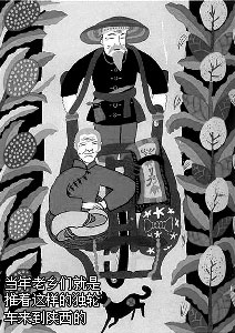 随后,我们在他的带领下,找到了我们提前打听的一位老者,现年80岁的孙元科老人,据老人介绍,村子里的大部分人祖籍都是山东昌邑,也有一部分来自与昌邑打交界的平度高密等地,现在这个村子是陕西省山东村中最大的村子之一,有600户约2000余人,称得上是山东村的老大,另一个是三原县大理村,被称为“陕西香油第一村”,因村民善于“用香油灌满钱袋”而远近闻名。当地人管这些山东村称为“山东堡子”。谈话间,老人用记忆的思绪为我们描绘了一幅山东乡亲迁徙图:大约一百年前,因为饥饿、灾荒或者战乱,他们的祖先们背井离乡,挑着晃晃悠悠的担子、推着吱呀作响的独轮车,告别了胶莱河,告别了亲人故土,一批一批千里迢迢从潼关叩关而入。为了生计,不远千里来陕西关中‘吊庄’,种一季庄稼,收割后又回去,时日既久、人事渐熟,对关中感情渐深,于是呼朋引伴、远道而来。加之解放前渭北战乱,关中土地大片撂荒,山东人在诸多优惠条件下大举迁进,‘山东堡子’纷纷破土而立。”