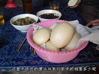 适逢中午,在老乡家里,我们品尝到了老人刚刚从锅里端出来的发面馒头,我们知道,这种东西在陕西是没有的,老人们非让我们品尝一下,尽管我们已经吃过午饭,但是,将那块馒头放入口中,久违的味道就传遍了全身,一丝发酵的酸,带着小麦面的清香,唤起了家的记忆。老人们看我们吃的甜,走的时候硬是塞到了我们包里几个馒头,让我们带回去品尝家的感觉