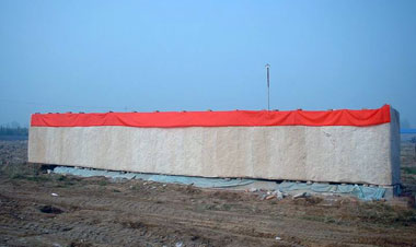 据该公司巨石门标事宜负责人姜国栋先生介绍,帝园公司于一年前确立建造巨石门标方案,三个月前寻找到适合开采的矿山,整个开采过程一波三折,一开始是用雷管爆破,总是一爆破中间就有裂痕,无法开采出理想长度的石头;后来又实施第二个方案,少放炸药,手工开凿,成功开采出了一块12米长的巨石,结果在吊装时巨石从中间断成了两半!最后又从悬崖中间寻找到了合适开发的地段,经过近三个月的艰辛开凿,终于成功打出一块长14.1米宽1米高2米更硕大的巨石,并于9月27日成功运抵公司基建工地。