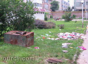 这个锈迹斑斑的垃圾箱,已经到了退休的风烛残年,也难怪众多垃圾不愿意安居其内,可是以如此青草地来为垃圾堆当“地毯”是否也太奢侈了一点?