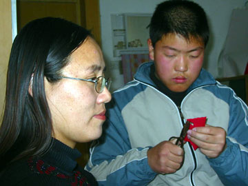 面对真实的人体,不到一分钟就能剪出来,并且是剪谁象谁,这就是“小神剪”陈星旗的剪纸功夫。 今年14岁的陈星旗是昌邑艺术中学的学生,他的爷爷是曾在国内外获过大奖的的民间艺术家陈光宗。从四岁起,他就在爷爷的指导下学习剪纸艺术,七、八岁时就已经具备了一个剪纸艺术家的基本功。如今,小星旗已是远近闻名小剪纸艺术家了。图为陈星旗面对真人,进行现场剪影。