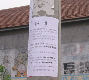 今日上午,一辆标有红十字标记的白色面包车缓缓驶入围子一带,并不时在路旁停靠。每次停车以后,都会匆匆下来几个穿白色大褂的成年男人将一种宣传材料贴在路旁的电线杆或墙壁上,然后匆匆上车离去。走近他们张贴的东西一看,才发现是某乡镇卫生院张贴的医疗信息宣传单。该车沿下小公路从围子向南一路张贴过去,沿途路口和一些企业大门两侧的电线杆或墙壁上贴满了他们的“特种信息”。
