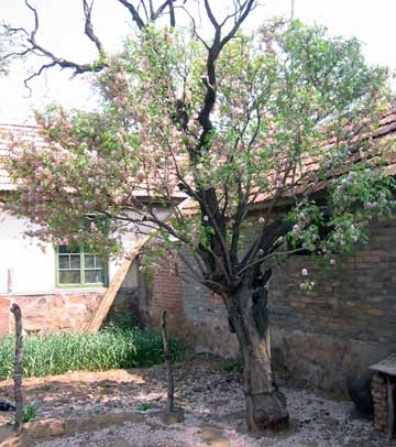 据主人王述庆介绍,这棵树栽于清朝乾隆年间,当时这里是一处私塾,一位名叫王卓的先人种下了它。这棵树每年春天都要开花,初开时为纯白色,以后逐渐变黄,最后变成红色,红花掉落后开始坐果。