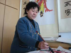 郝玉华画梅花,用墨浓淡相宜,有轻有重,画出的梅花笔法流动,神采飞扬。再看整个画面结构,只有部分梅花画得清晰,余者皆“涂涂抹抹”,真有“触目横斜千万树,赏心只有三五朵”的意境。画里,透着这位农家妇女水滴石穿的学习毅力和绳锯木断的钻研精神。十年的功夫,郝玉华画的梅花已小有成就,在她的笔下,一朵朵梅花藐霜傲雪,花团锦簇,多次参加展出,深受好评。在昌邑书画界,郝玉华更是同行的佼佼者,只要是提起画梅花的,人们自然就想到了她。