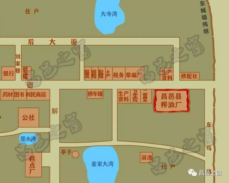 1957年,昌邑县榨油厂由集体转为地方国营,昌邑第一个全民工厂出现。厂址在今城里街北海公园南门西侧路南,今公园道一号位置。