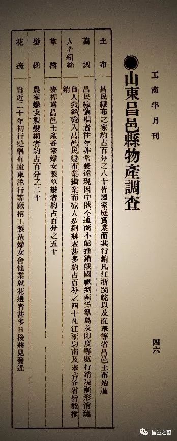 以上所刊昌邑特产,均与纺织编造有关,足以看出当时的昌邑纺织业及手工编织业之繁盛。