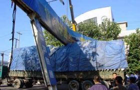 大货车强行过街 广告牌卡住车身,<IMG alt="" hs
