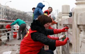 昌邑义工洗刷石渠围栏迎接雷锋日,