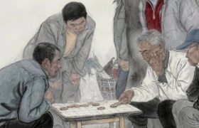 刘鹏辉.《农家生活系列之六-弈会》200cm x 190cm,纸本设色,2017年入选“美在京津冀-纪念改革开…
