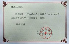 韩庆林《岞山站村志》获省历史学会优秀成果一等奖,<div style="text-align: center